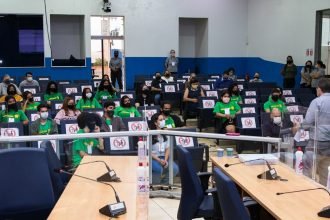 Os alunos foram recebidos em plenário e utilizaram seus celulares para participar…